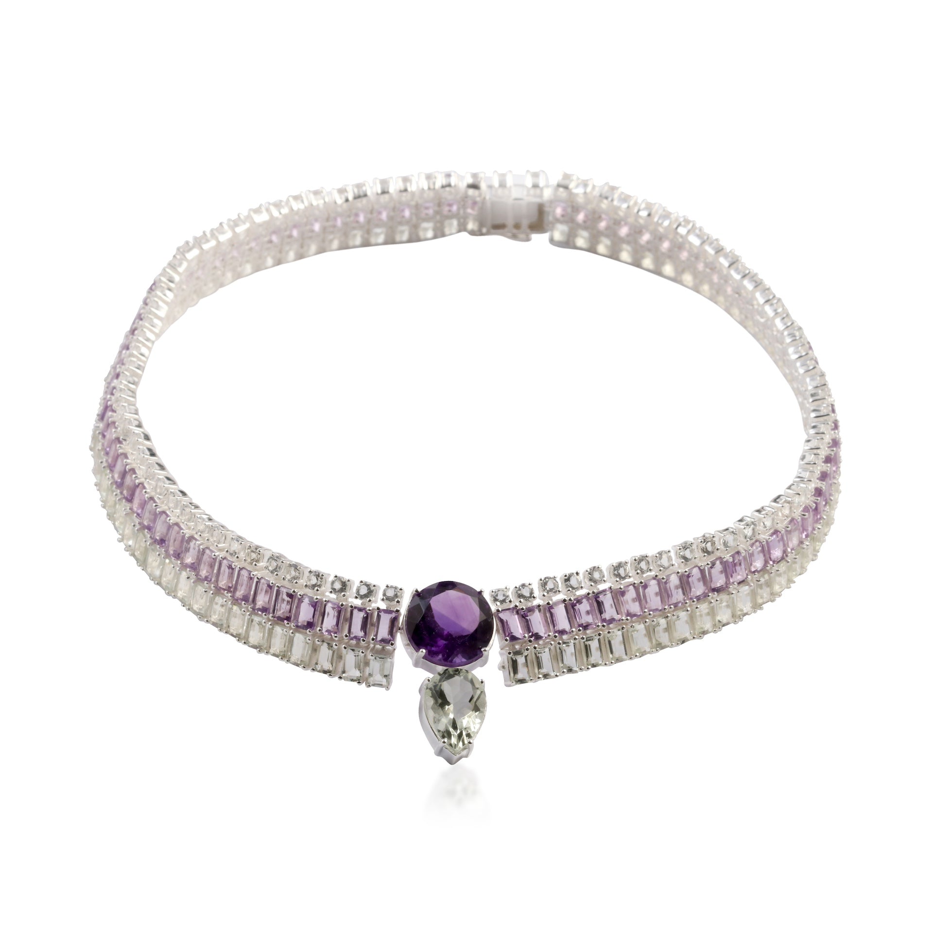Green and violet amethyst and aquamarine stones make up this elegant Guan Yin choker necklace.