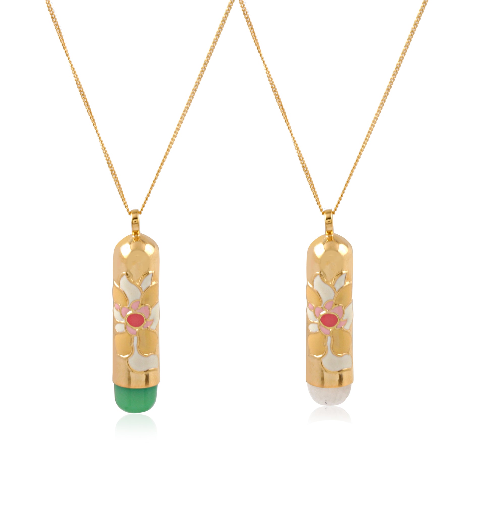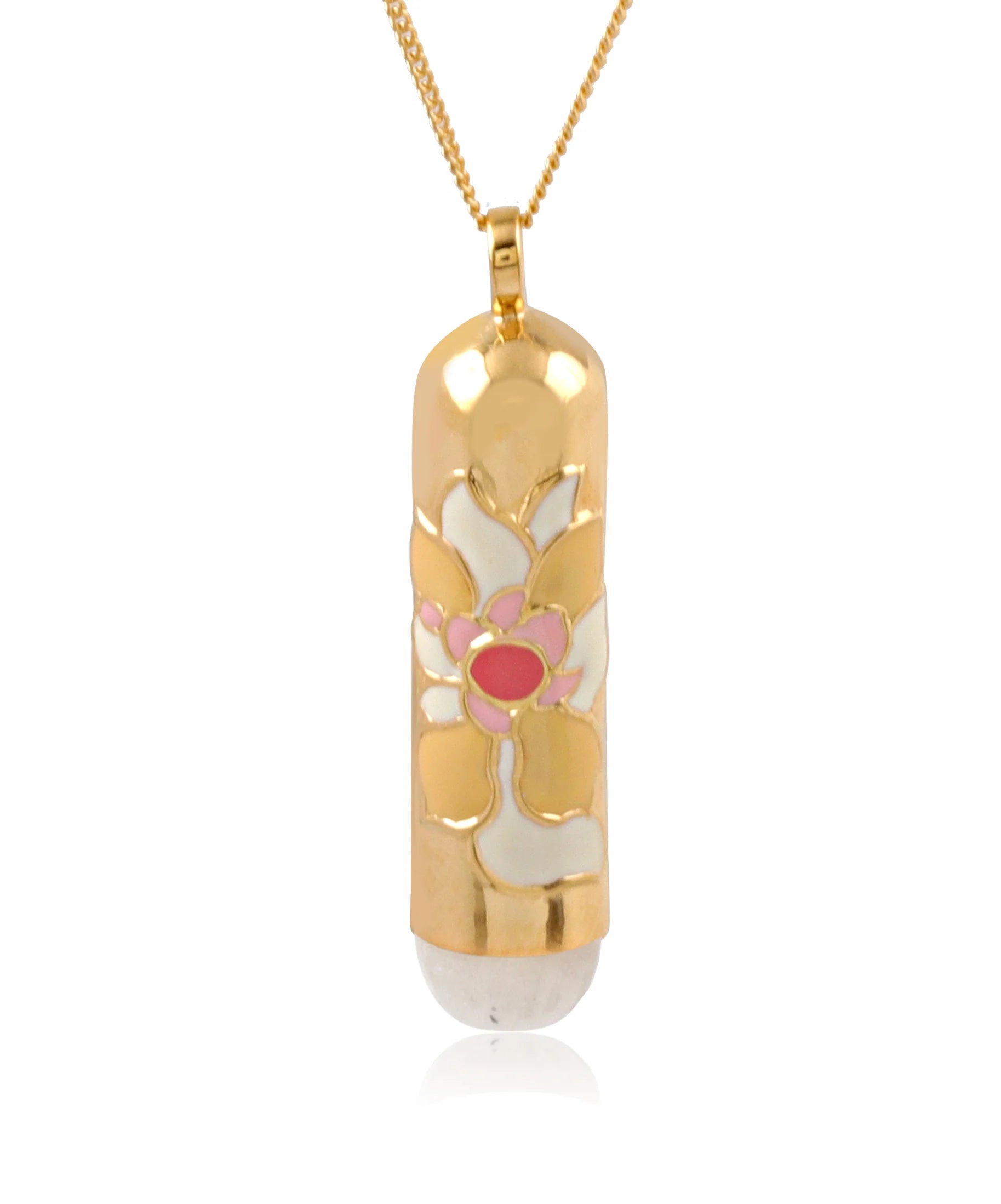 Handmade pendant and chain, available with chrysoprase, rainbow moonstone, or labradorite stone. The blooming lotus floral design was made using a traditional hand-carved stamp technique and then hand-painted with enamel. Both pendant and chain are 2 micron 18kt gold plated sterling silver . In an effort to be as sustainable as possible, the piece is made from recycled gold and silver and ethically sourced gemstones.