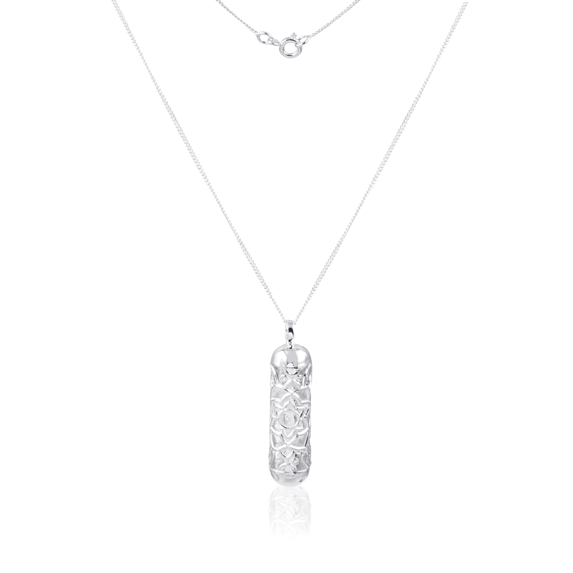 Handmade pendant and chain. The geometric lotus design is made using a traditional handcarved stamp technique. The pendant is hollow and opens on one end, so you can put your love notes, mantras, intentions, prayers, cherished sayings inside and carry them close to your heart. Available in sterling silver or 18k gold-plated sterling silver. Comes with a 45cm curb chain.