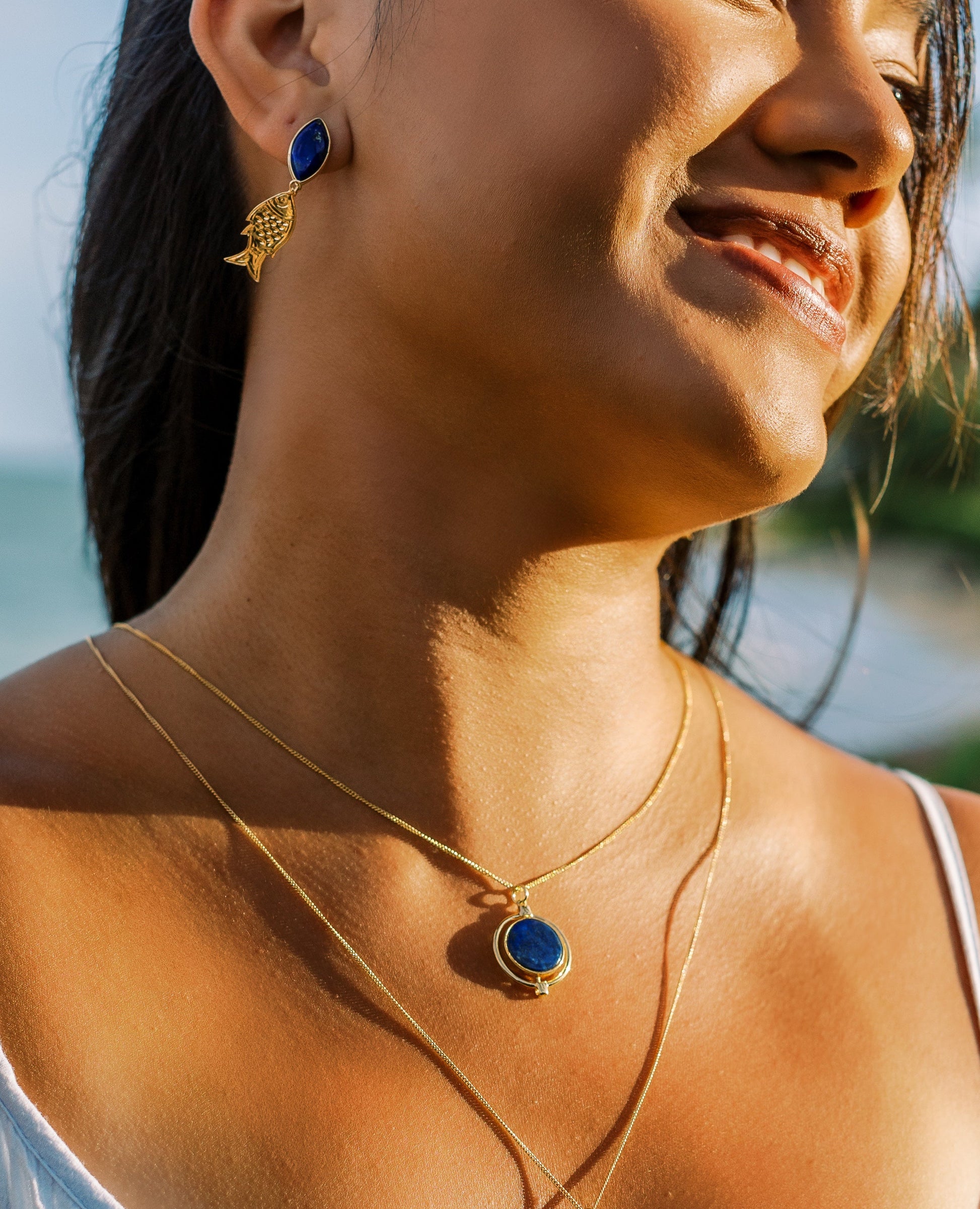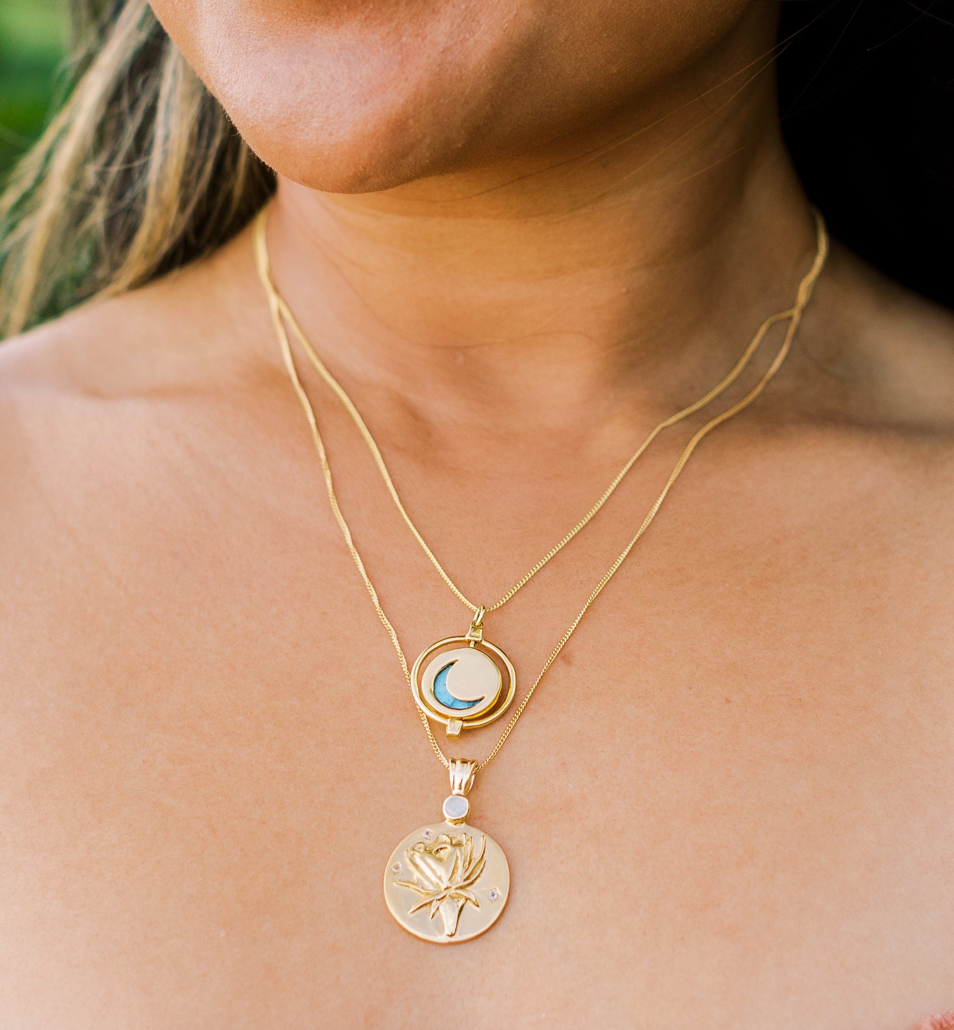 Includes a Moon-Dial charm necklace, a night blooming cereus medallion necklace and fish earrings, with savings of 20%. The Medallion necklace has "e mohala" engraved on the back, which means "to blossom" in Hawaiian. All pieces are 18k gold-plated sterling silver and you can select your stone type below.