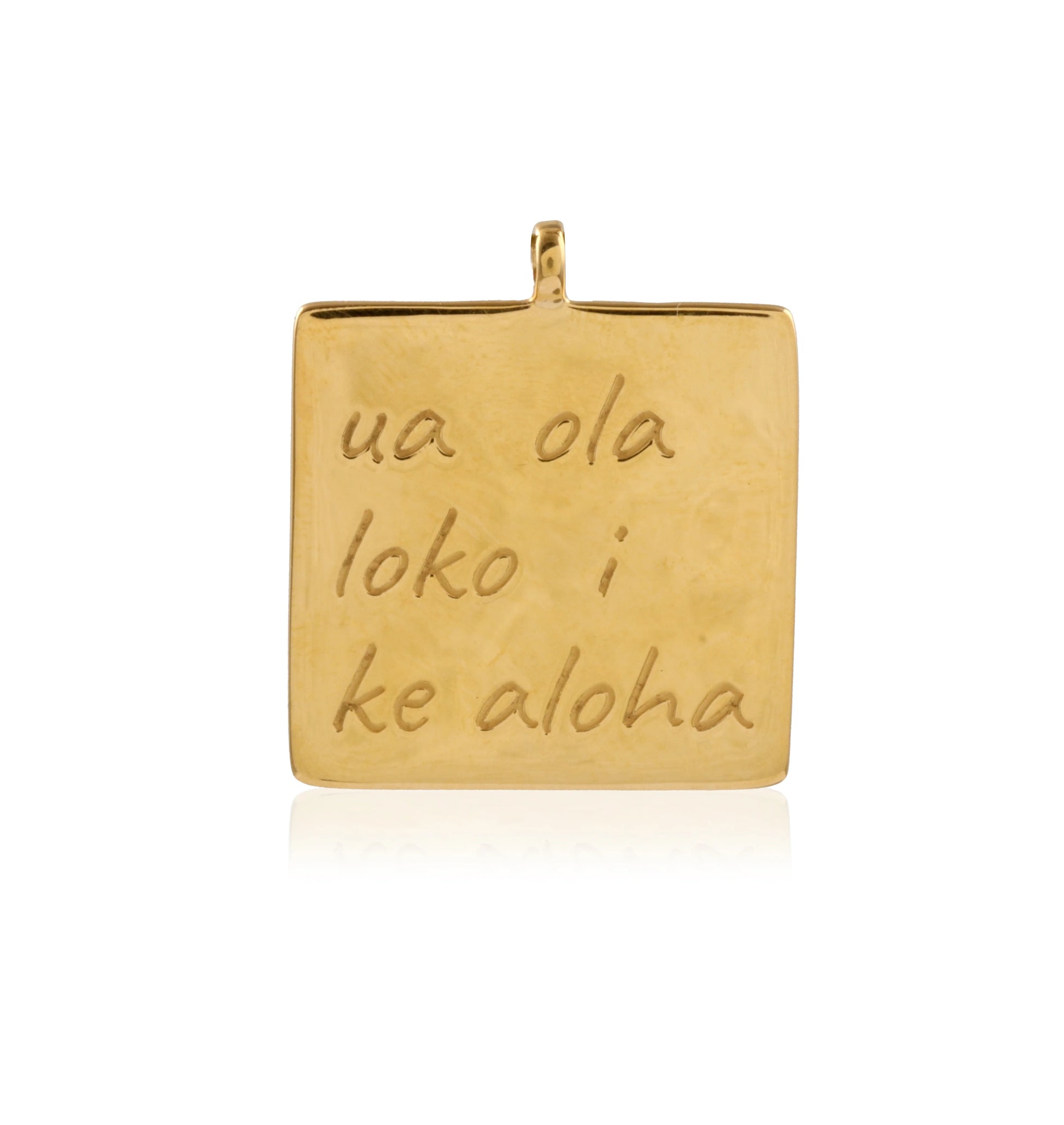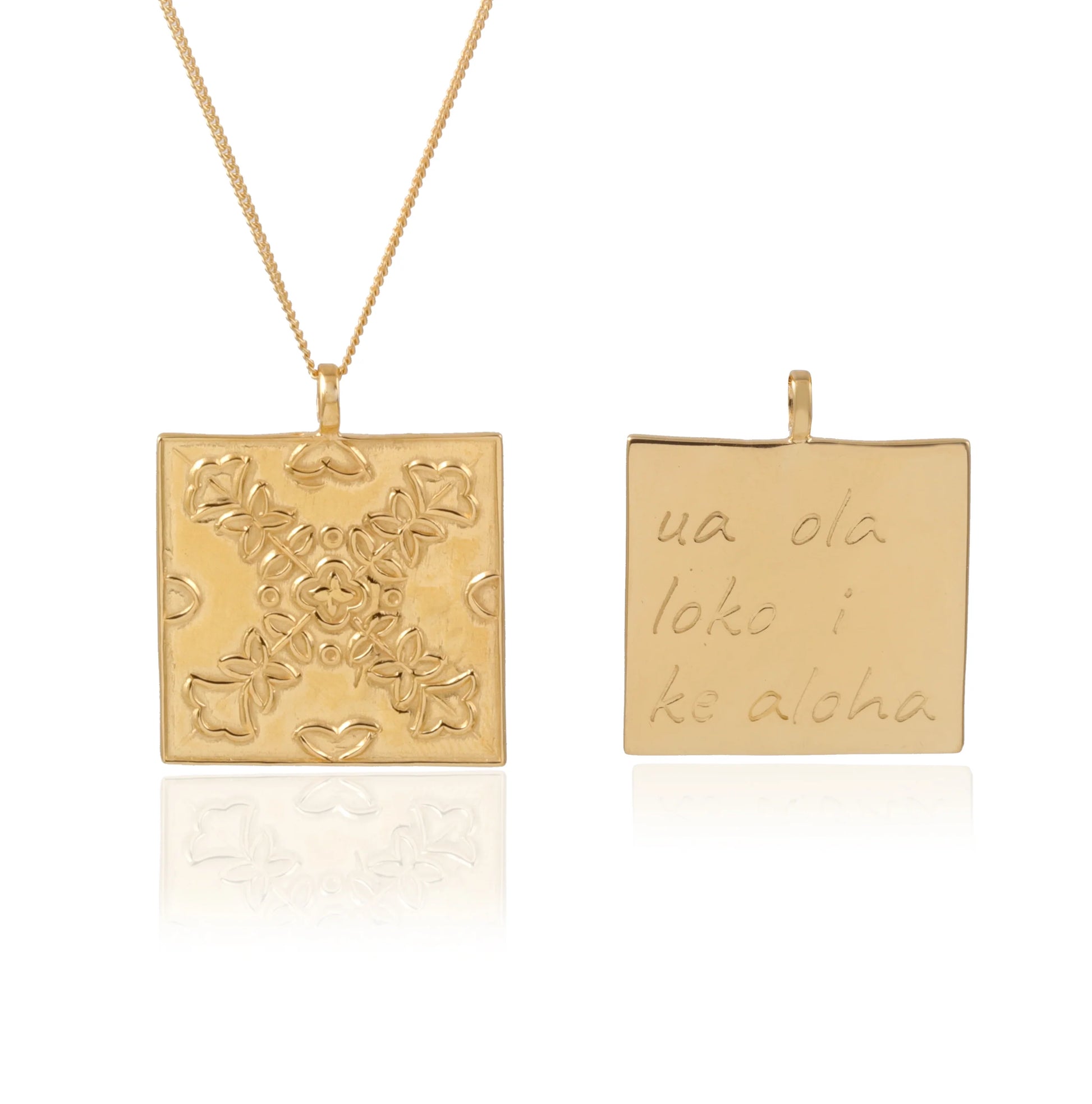 The OHIA tree is endemic to Hawaii and plays a key role in the local ecosystem as well as cultural traditions. Adapted to grow directly on lava rock, the Ohia tree portrays incredible resilience and an ability to persevere despite apparent obstacles. The Ohia tree also represents the loyalty of love and the joining of masculine and feminine principles, with Hawaiian legend telling the story of how two lovers became eternally bonded within the tree: Ohia, the man, became transformed by the gods into the tree itself and Lehua, the woman, not wanting to be separated from her love, becoming its flower. The Hawaiian saying engraved on the back of this piece means "Love sprouts life within".