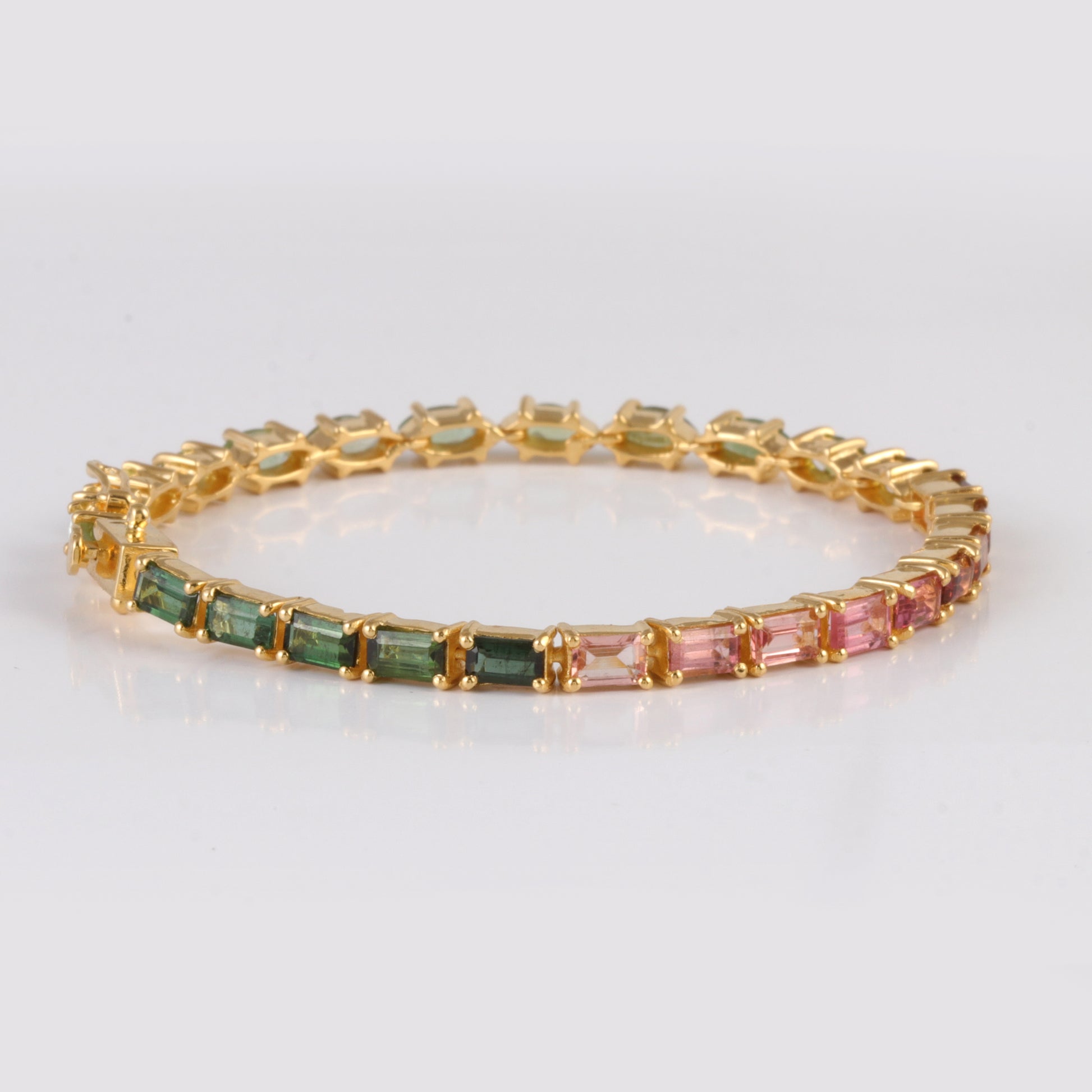 Green and pink tourmaline tennis bracelet, made with a mix of rectangular and marquise stones to mimic the Lei being made in the Lei Maker painting.