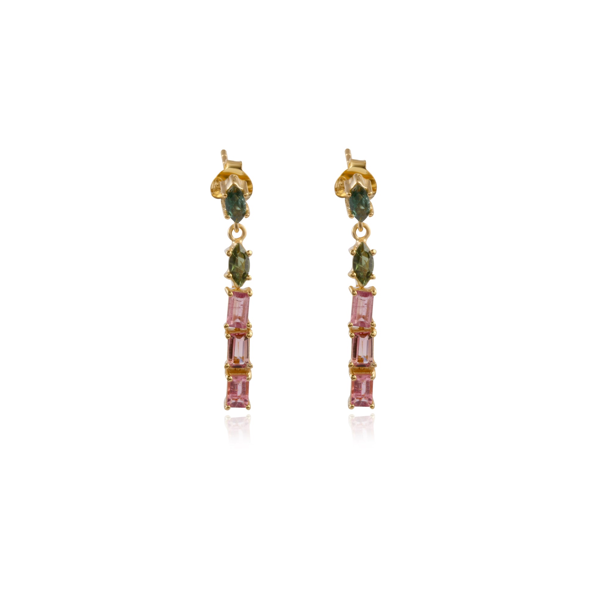 Green marquise and pink rectangular tourmaline stones make up these elegant dangly earrings.