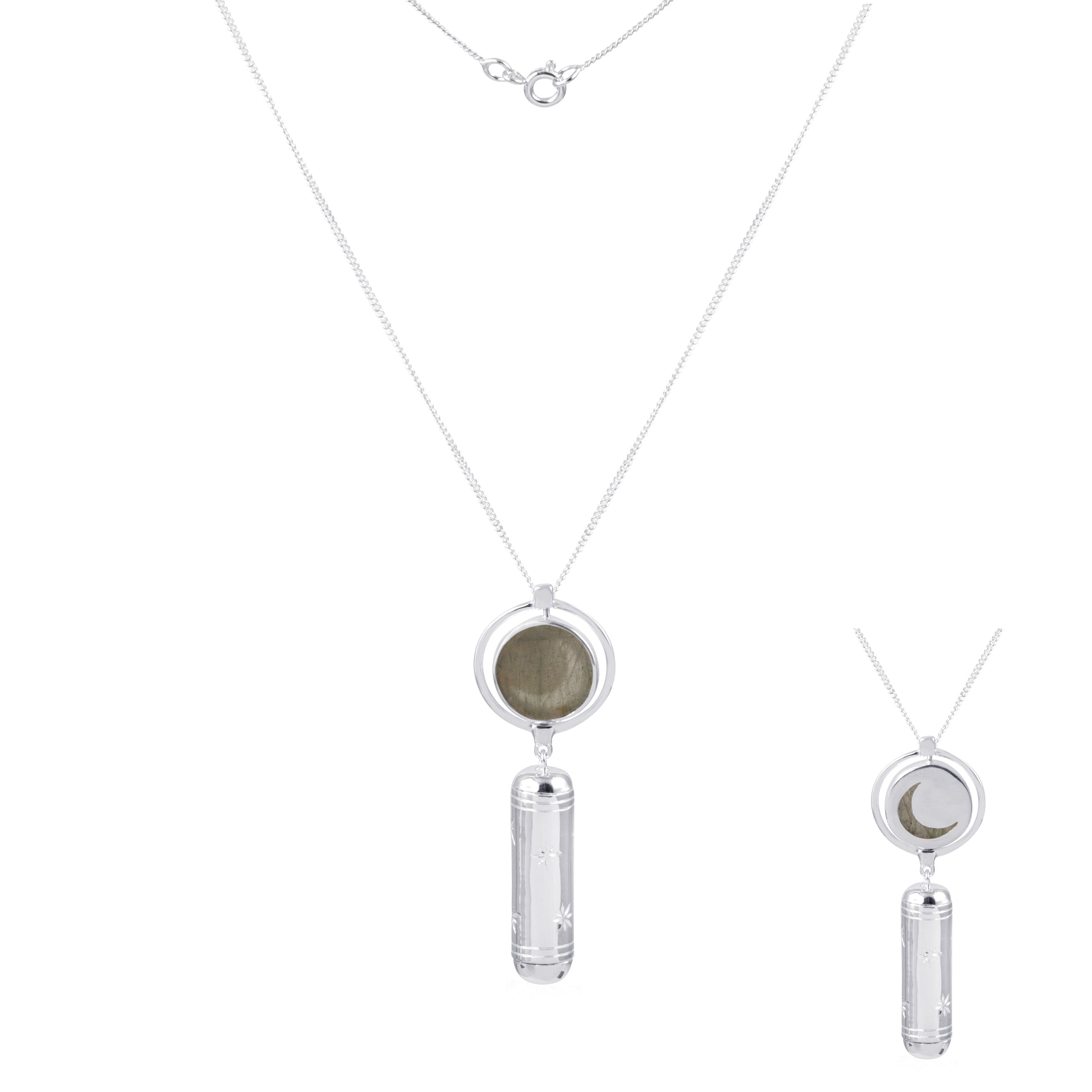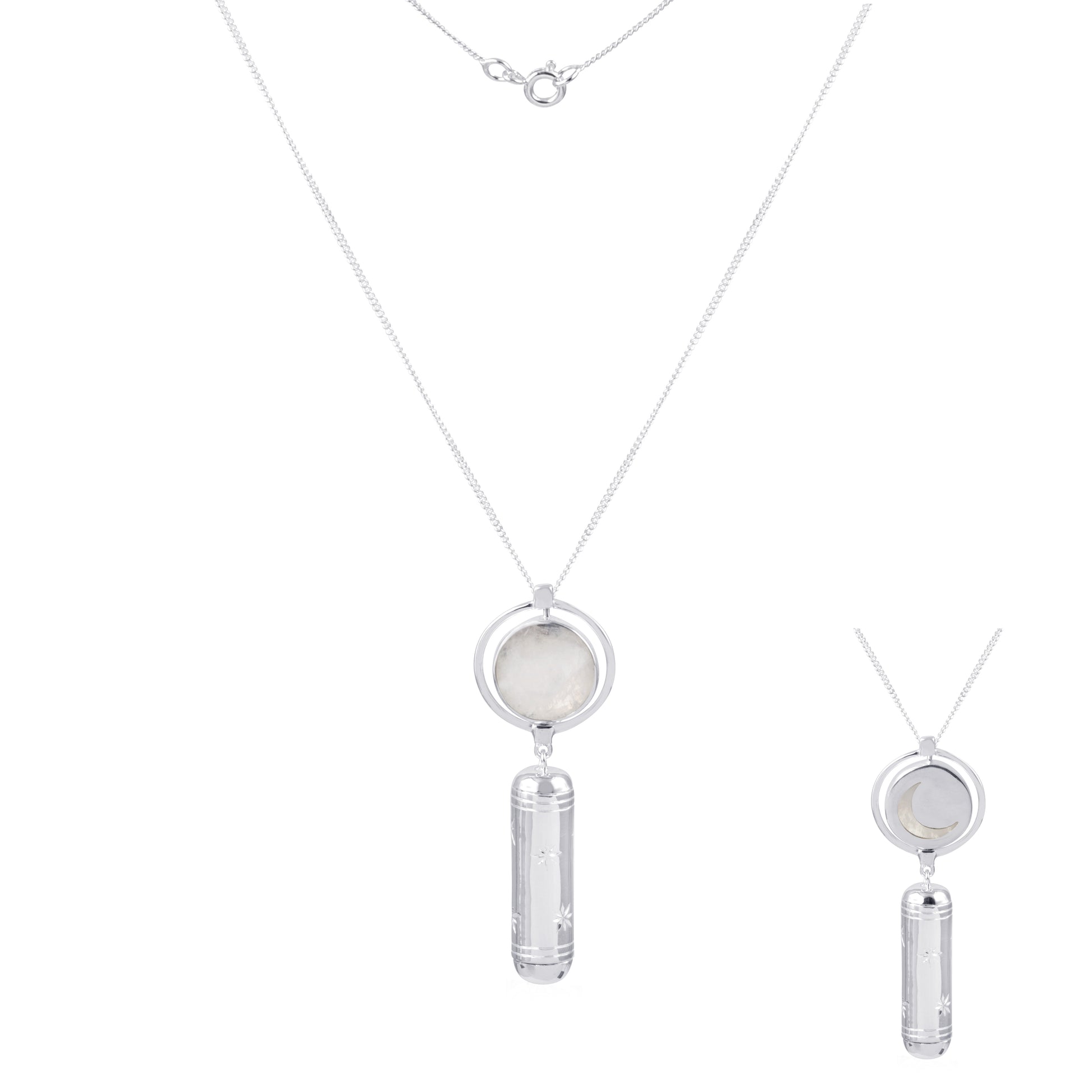 Handmade moon-dial necklace, with a spinnable gemstone moon that turns to show either a full or crescent moon. The hanging capsule amulet - engraved with little stars - is hollow and opens on one end, so you can put your love notes, mantras, intentions, prayers, cherished sayings inside and carry them close to your heart. Available in sterling silver or vermeil (18kt gold-plated sterling silver). Comes with a 45-50cm adjustable curb chain. In an effort to be as responsible as possible, the necklaces are made from recycled gold and silver and ethically sourced gemstones.