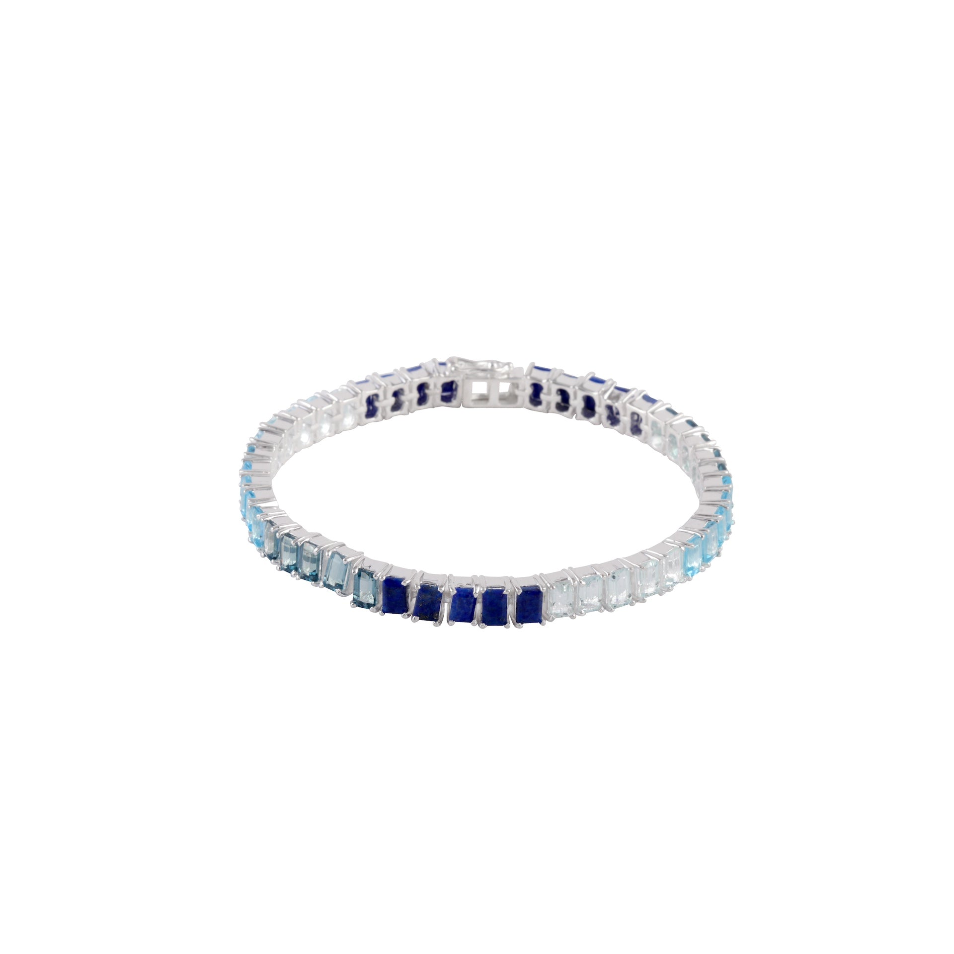 Lapis lazuli, London blue topaz, Swiss blue topaz and aquamarine comprise this elegant ocean-inspired tennis bracelet.